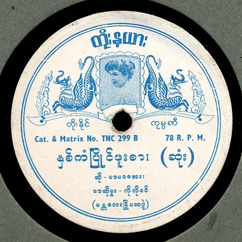 As in most of Southeast Asia, there was quite a proliferation of independent labels in Burma in the 1940s and 1950s after years of domination by the Gramophone Company and HMV. Considering that Mar Mar Aye was born in 1942 this record must date from the late 1950s or early 1960s. This is one of the few records I’ve come across on the Toe Naing (Dragon) label.