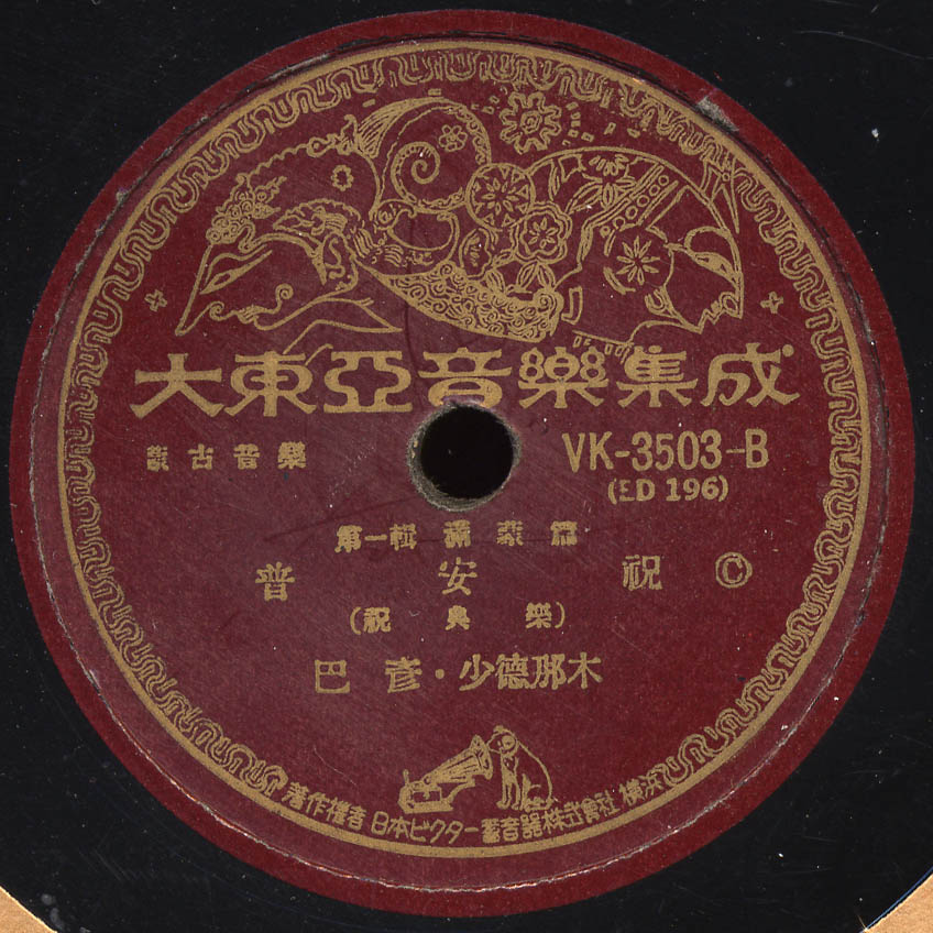 I picked up this record in a batch of 50+ Chinese and Japanese records. When I saw this strange label I knew I was onto something. My first guess was that it was Korean, even though the writing was in Japanese. Wrong! It turns out that this was part of a set called “The Ultimate Collection of Great East-Asian Empire’s Music” and was put out by Victor Japan, most likely in the late 1930s. It seems to have been something of a propaganda piece as Japan was trying to promote the idea that all the areas under it’s control (Inner Mongolia, Manchuria, Taiwan, Korea, and others) were part of one great “East Asian” Empire. If anyone has further information on this set, please contact me!