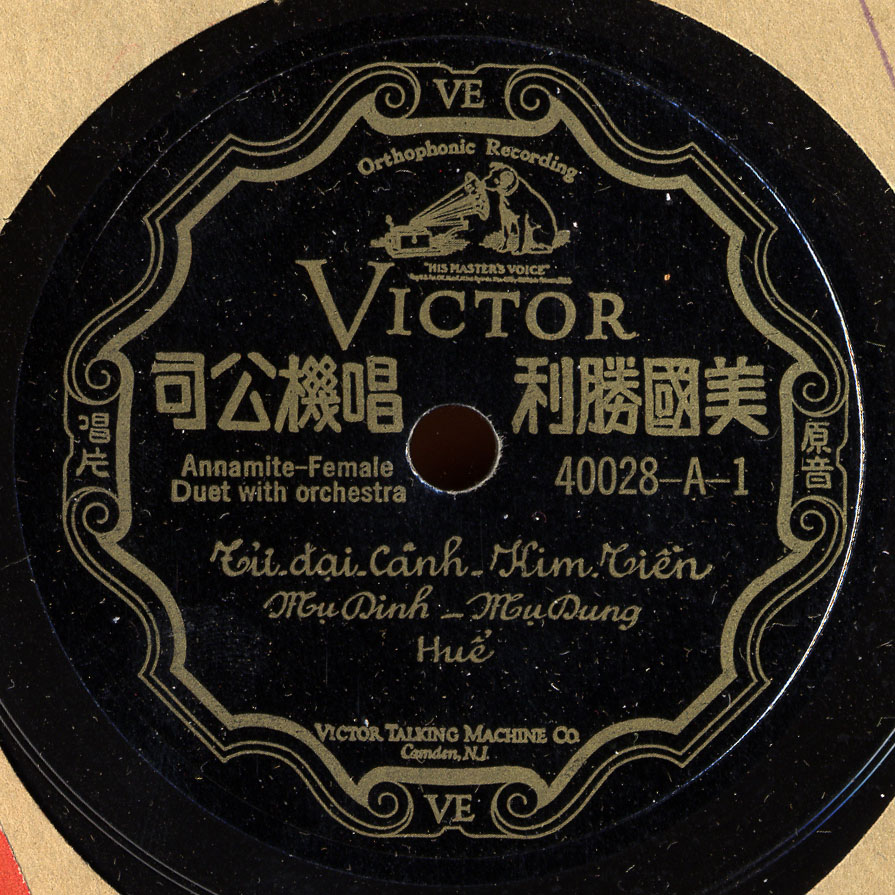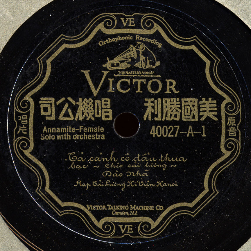 This record was recorded in 1927 for Victor’s 40000 series, a mysterious group of recordings from Indochina, as it was then called. I have yet to find any solid discographical information on this series aside from a mention of the above dialects in an old Victor catalog (thanks to Du Jun Min). This series is followed by the 42000 series of Chinese (mostly Cantonese) records.