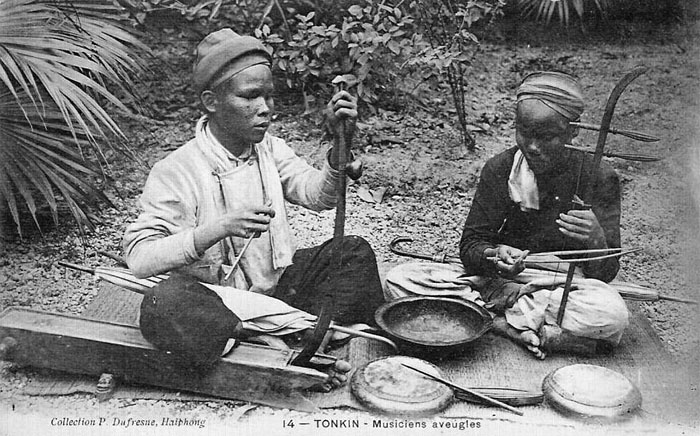 Although Vietnamese music is highly influenced by Chinese (Vietnam was ruled by China for almost 1000 years!), the are many distinctive instruments, especially stringed lutes with raised frets. Here’s a few old postcards depicting Vietnamese musicians and some unique instruments, ca. 1900-10.